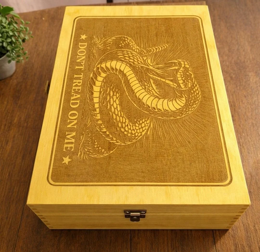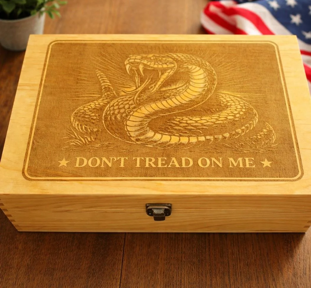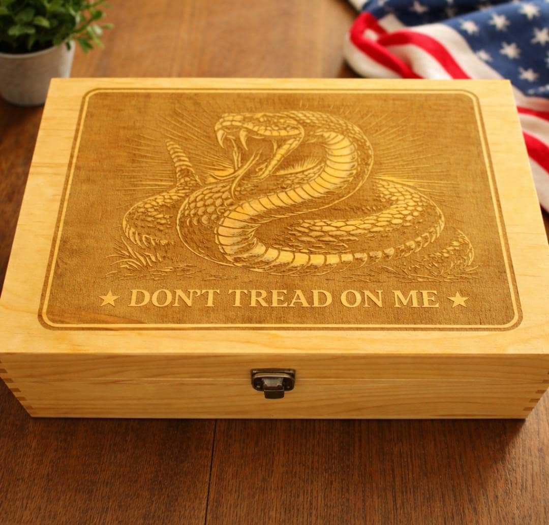 This engraved wooden keepsake box features a bold "Don't Tread on Me" rattlesnake design, making it a perfect patriotic gift for men, groomsmen, or anyone who loves American heritage and rugged decor.