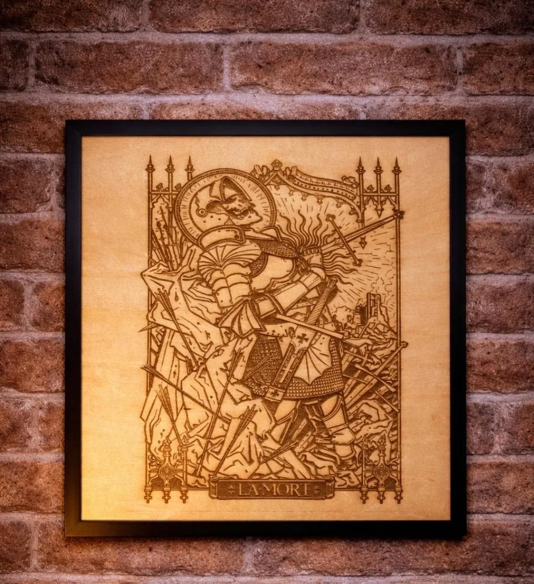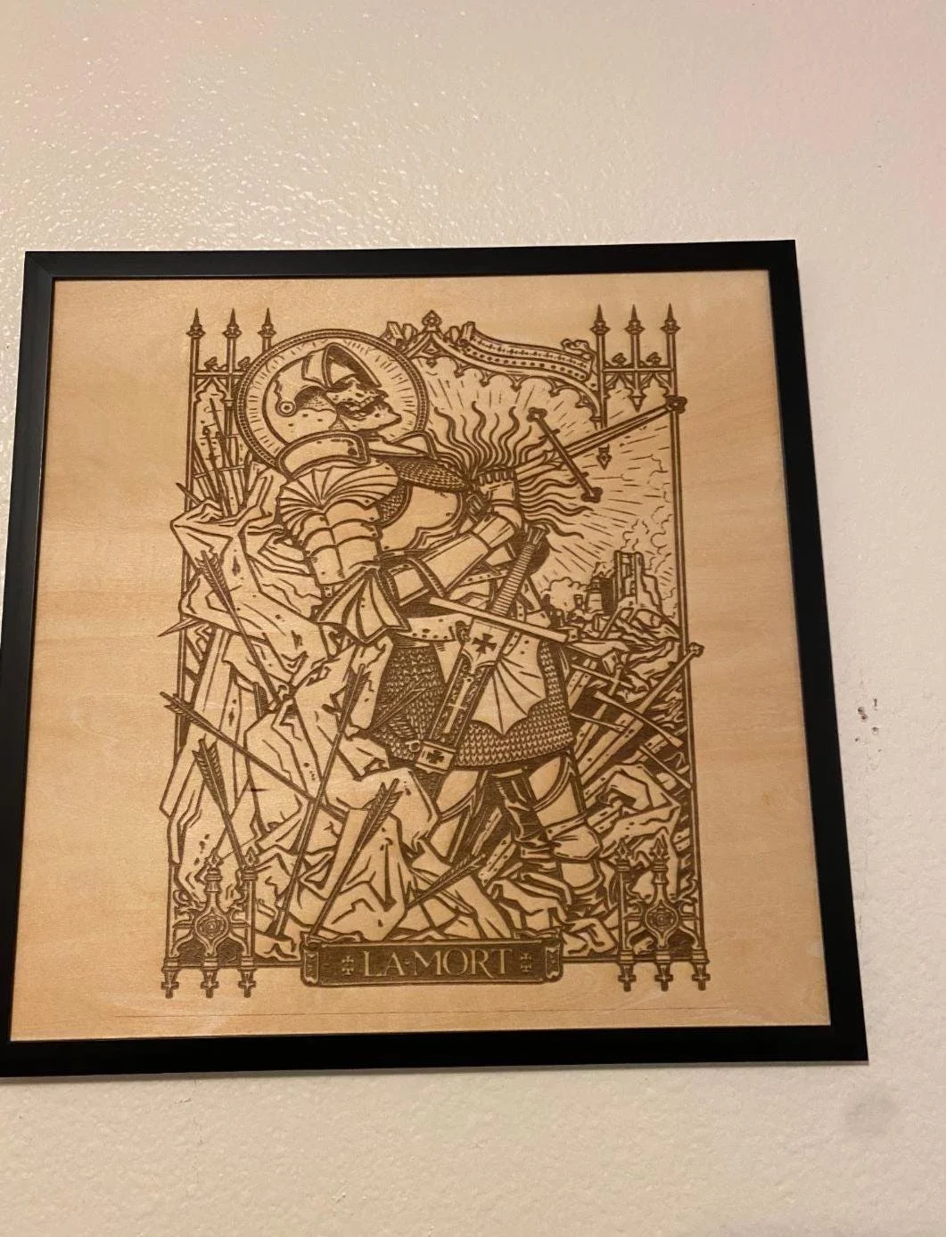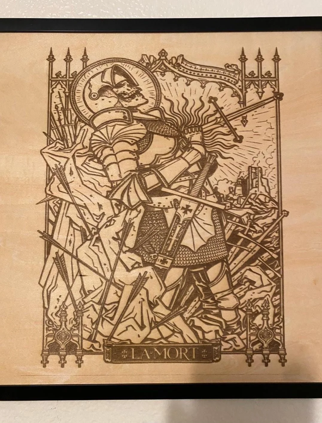 La Mort Knight Laser Engraved Wood Sign: Medieval Gothic Decor, Rustic Man Cave Art