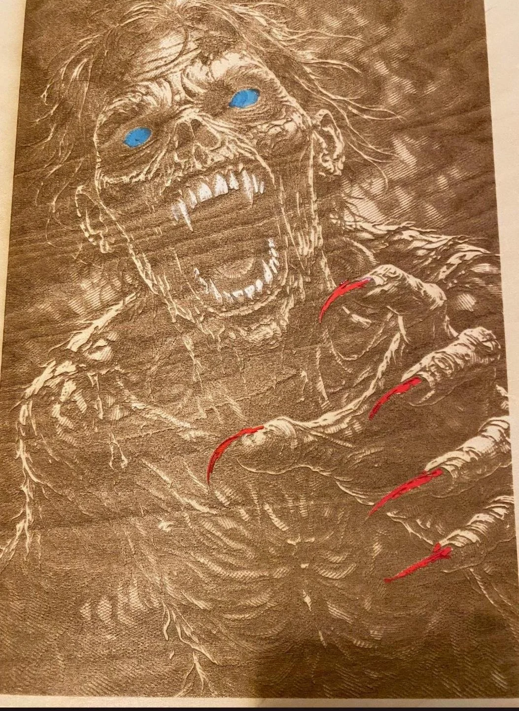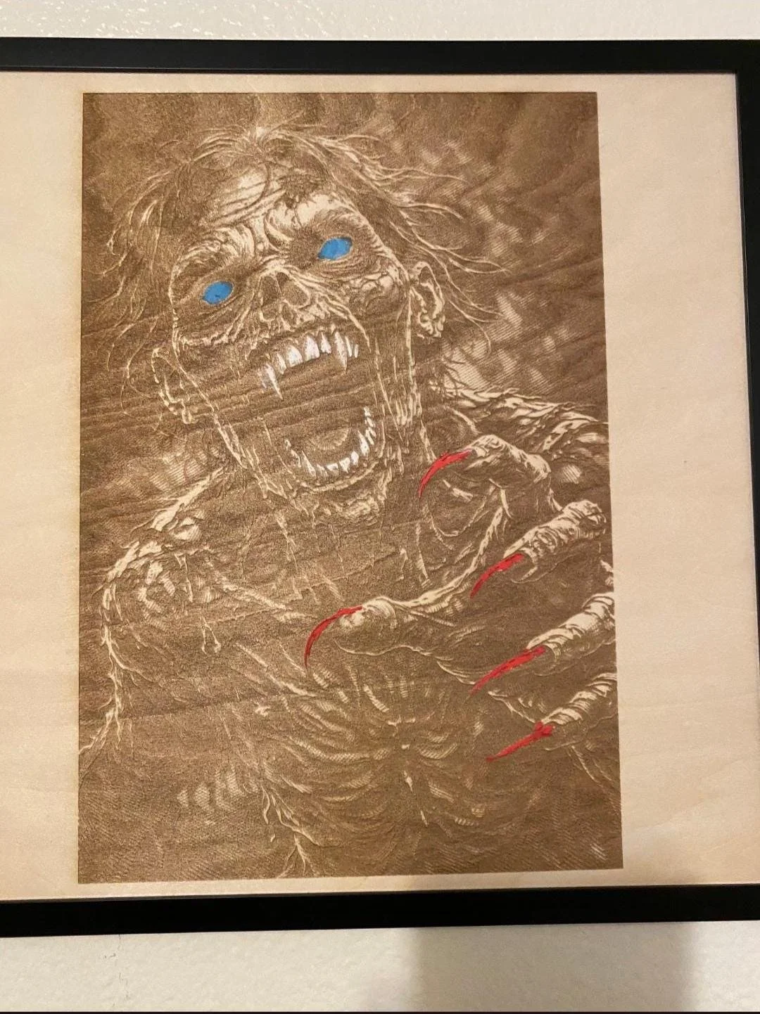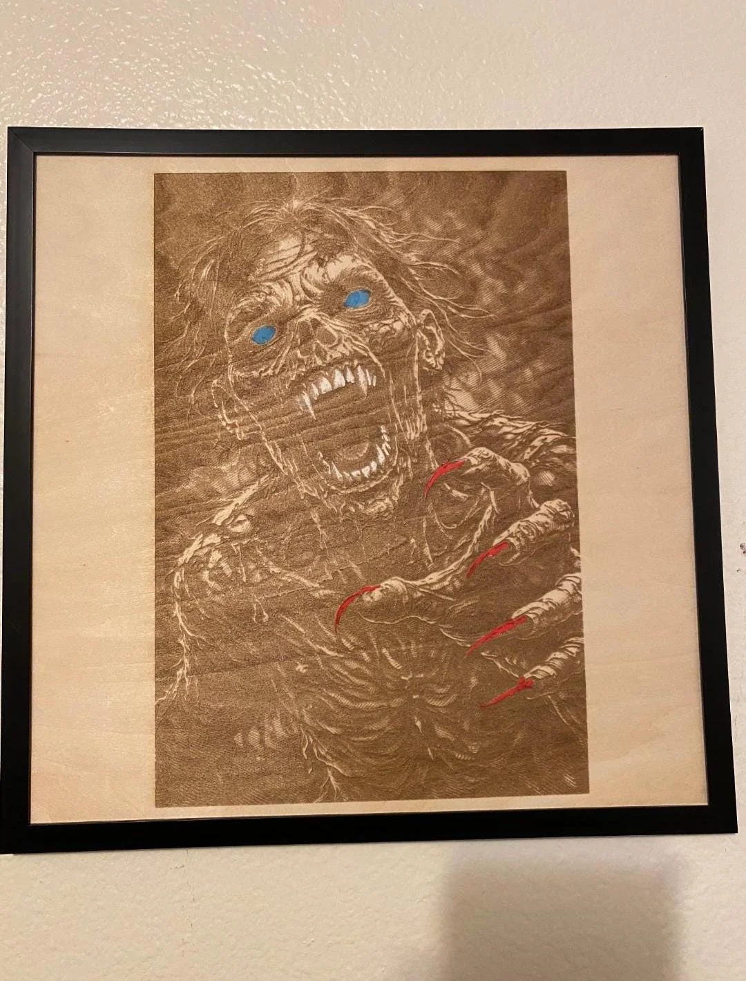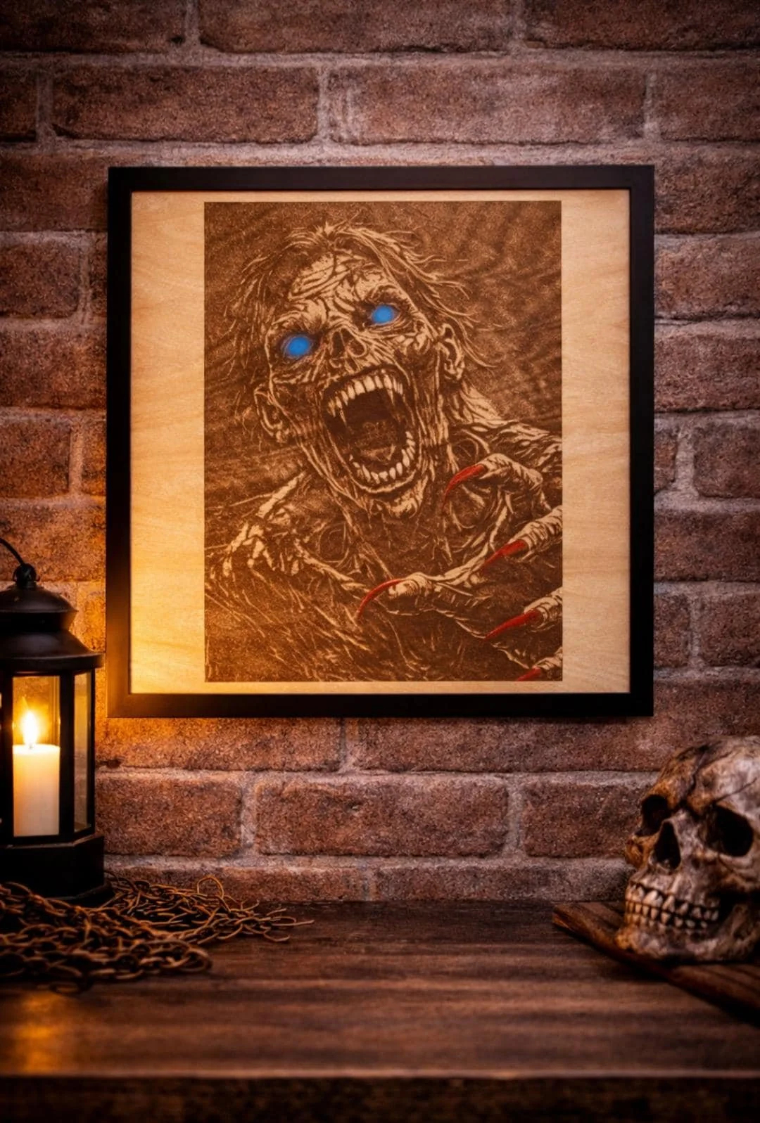 Each piece is engraved on real wood, making every artwork unique due to natural grain patterns. Product Details • Laser engraved wood artwork • Deep burn engraving (not printed) • Natural wood grain finish • Frame included • Handmade in the USA Perfect for: horror decor gothic wall art zombie collectors Halloween decor tattoo shop decor punk or metal fans man cave wall art alternative home decor Size Approximate size: 12 x 12 inches framed