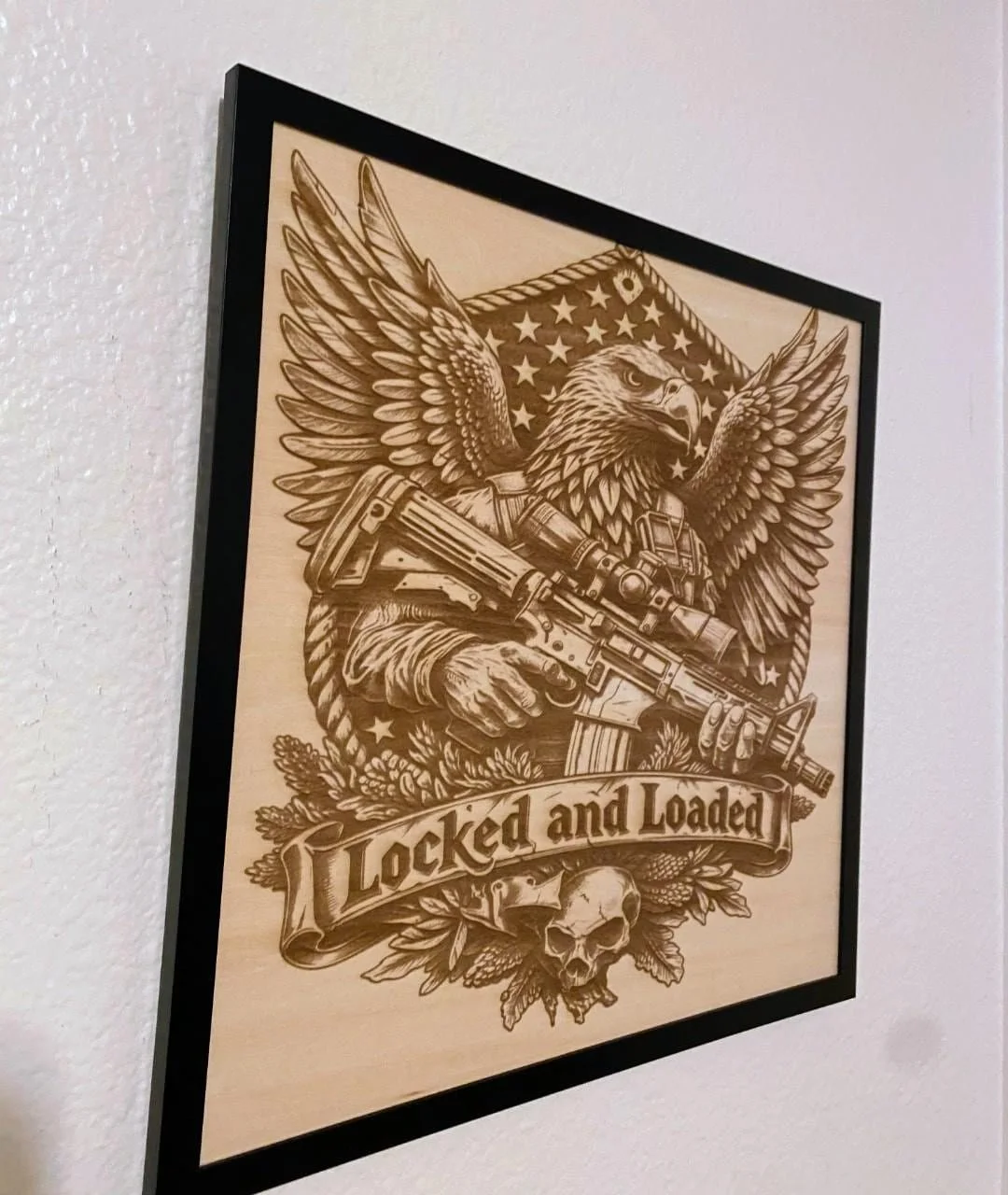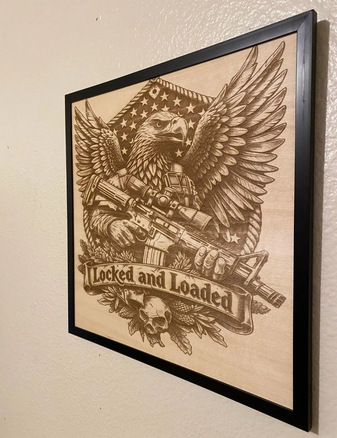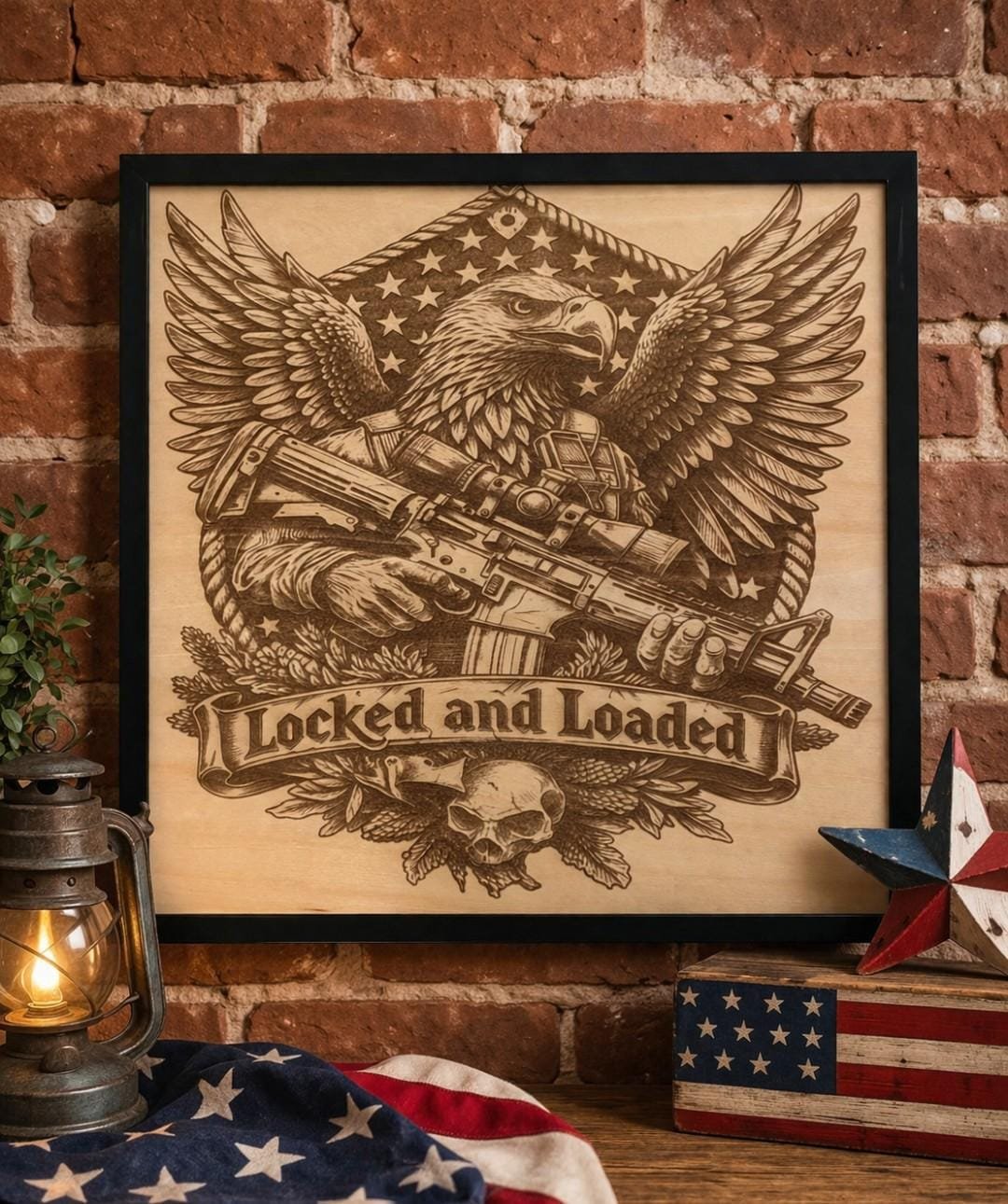 Make a bold statement with this handcrafted 12x12 laser engraved basswood wall art featuring a striking patriotic eagle design and the phrase “Locked and Loaded.” Precision engraved for rich detail and framed for a clean finished look, this piece adds rugged Americana style to any man cave, office, garage, or living space. Each sign is made with care using quality basswood and laser engraving for crisp lines, beautiful contrast, and lasting durability. The natural wood grain makes every piece one of a kind, giving your wall art a warm rustic character. Perfect as: • Veteran or military appreciation gift • Father’s Day gift • Birthday gift for him • Man cave / garage decor • Patriotic home decor Details: • Size: 12x12 inches • Material: Basswood • Laser engraved design • Framed and ready to display • Handmade in small batches Please note: Wood grain and tone may vary slightly, making each piece unique. Add this eye-catching piece to your space or gift it to someone who loves patriotic, rustic decor.