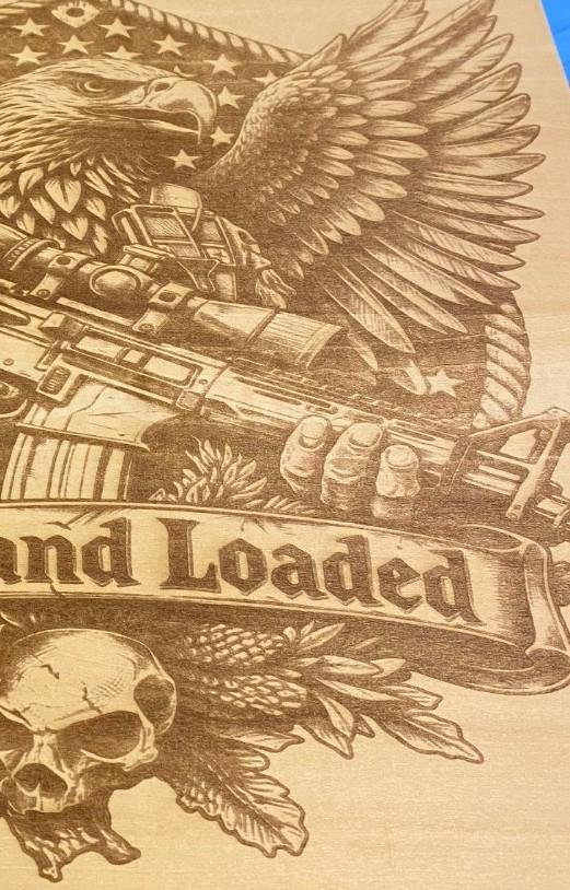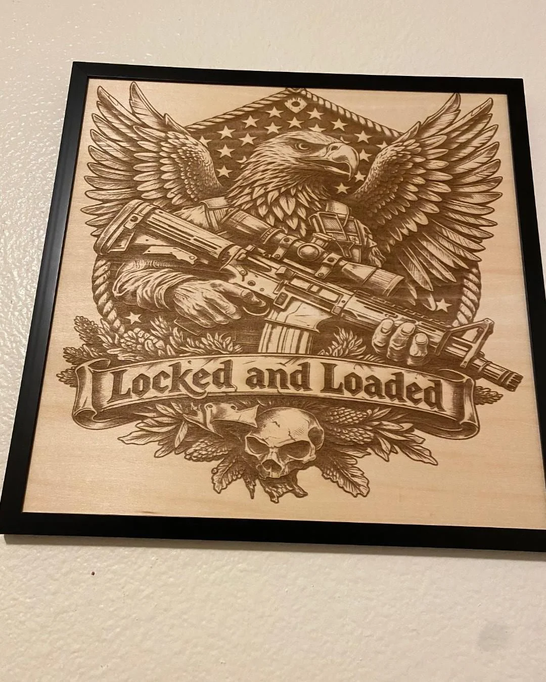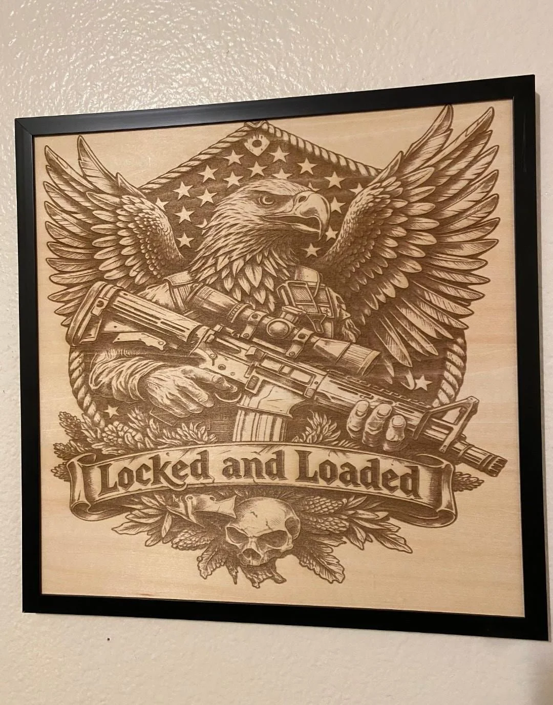 Make a bold statement with this handcrafted 12x12 laser engraved basswood wall art featuring a striking patriotic eagle design and the phrase “Locked and Loaded.” Precision engraved for rich detail and framed for a clean finished look, this piece adds rugged Americana style to any man cave, office, garage, or living space. Each sign is made with care using quality basswood and laser engraving for crisp lines, beautiful contrast, and lasting durability. The natural wood grain makes every piece one of a kind, giving your wall art a warm rustic character. Perfect as: • Veteran or military appreciation gift • Father’s Day gift • Birthday gift for him • Man cave / garage decor • Patriotic home decor Details: • Size: 12x12 inches • Material: Basswood • Laser engraved design • Framed and ready to display • Handmade in small batches Please note: Wood grain and tone may vary slightly, making each piece unique. Add this eye-catching piece to your space or gift it to someone who loves patriotic, rustic decor.