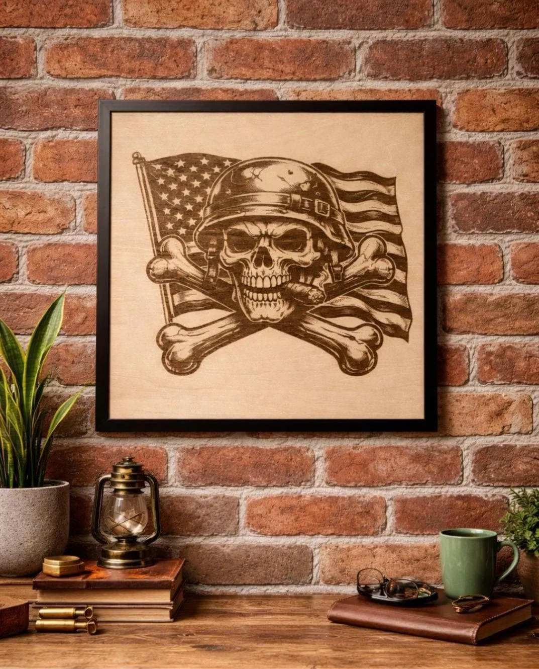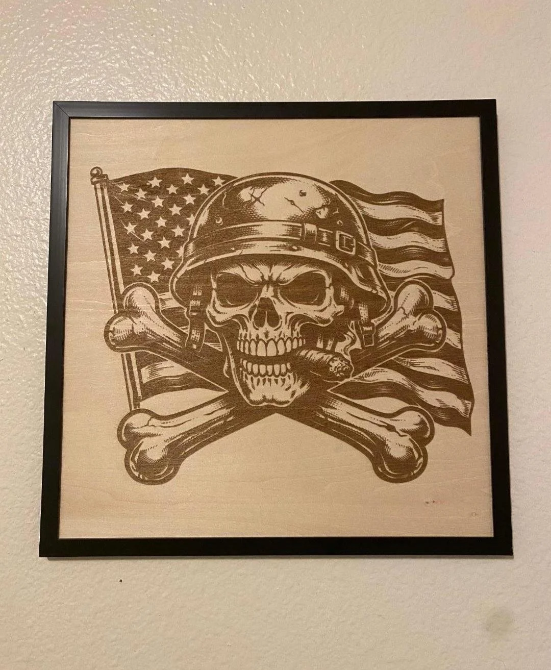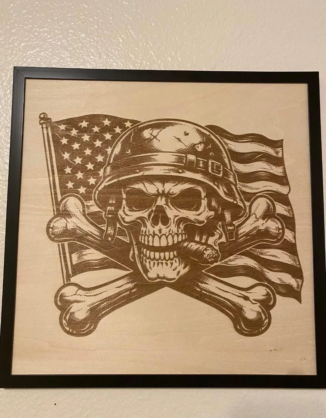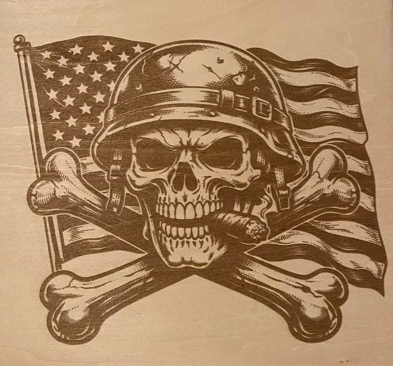 Bold. Rugged. Unapologetically American. This laser engraved wood wall art features a skull with crossed bones set against a waving American flag — the perfect statement piece for any man cave, garage, shop, or patriotic space. Each piece is crafted with precision engraving on natural wood, giving it a rich, burned-in look that won’t fade or peel. 🇺🇸 Perfect For: Man caves & garages Military & veteran gifts Patriotic home decor Father’s Day / birthdays Workshop or bar setup 🪵 Details: Laser engraved (not printed — permanent design) Natural wood backing (each piece has unique grain) Framed and ready to hang High-contrast engraving for a bold look 📏 Size: (Insert your exact size here — ex: 12” x 12” framed) 🎁 Gift Ready A unique, masculine gift that stands out — perfect for anyone who loves freedom, grit, and bold design. ⚠️ Note: Due to natural wood variation, grain and tone may vary slightly — making each piece one-of-a-kind.